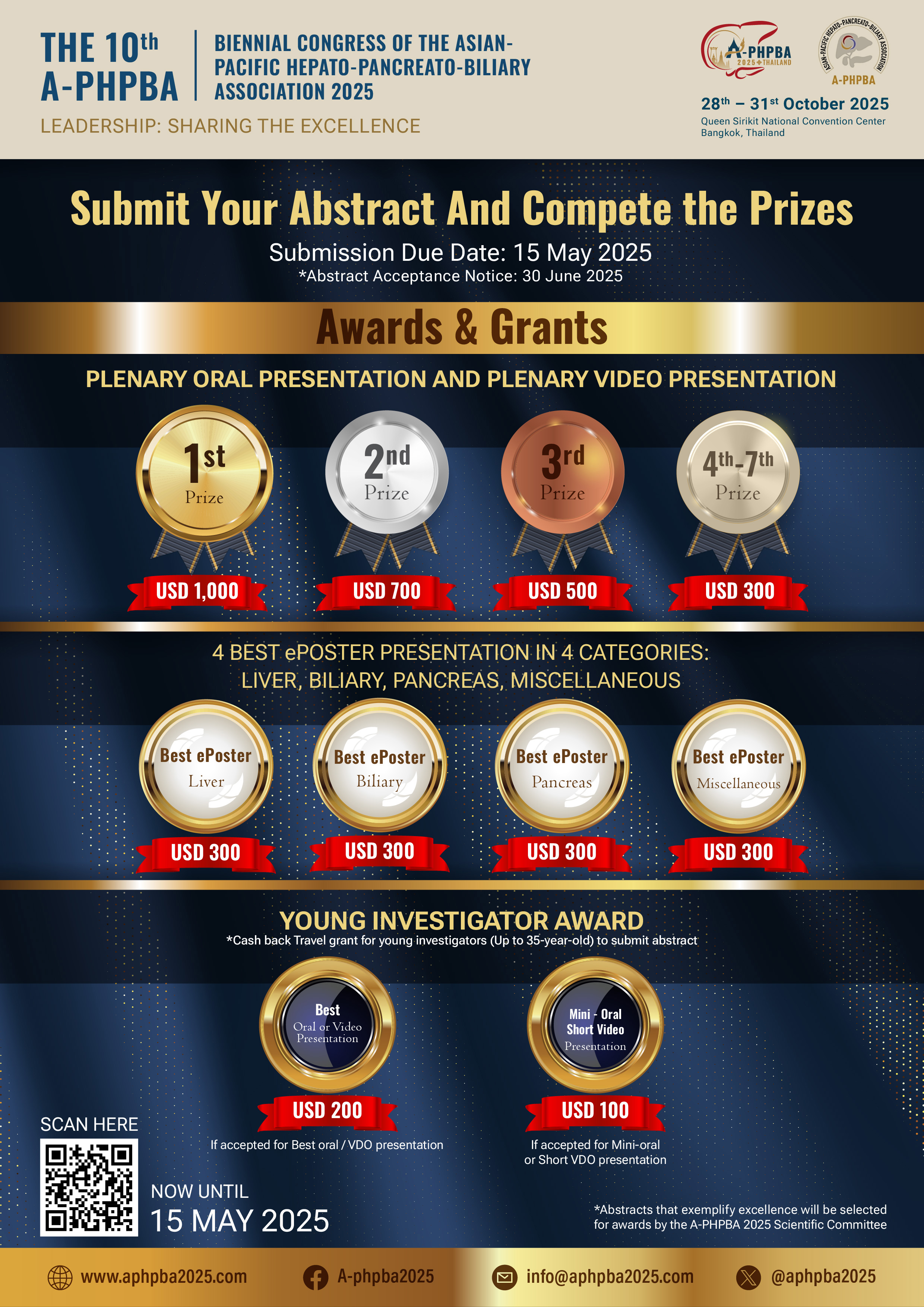 On behalf of Thai Hepato-Pancreato-Biliary Surgery Association of Thailand (THPBA) and A-PHPBA 2025 Local Organizing Committee, we are honored to invite you all to the upcoming “The 10th Biennial Congress of The Asian-Pacific Hepato-Pancreato-Biliary Association 2025 (A-PHPBA 2025)” which will be held during 28 – 31 October 2025 at Queen Sirikit National Convention Center (QSNCC) in Bangkok, Thailand under the theme “LEADERSHIP: SHARING THE EXCELLENCE” Additionally we will celebrate The 25th Anniversary of Thai Hepato-Pancreato-Biliary Association (THPBA). A-PHPBA is a non-profit organization with a great purpose of exchanging ideas and experiences through discussions, technical paper, poster presentations, sharing knowledge on recent knowledge and technological advances